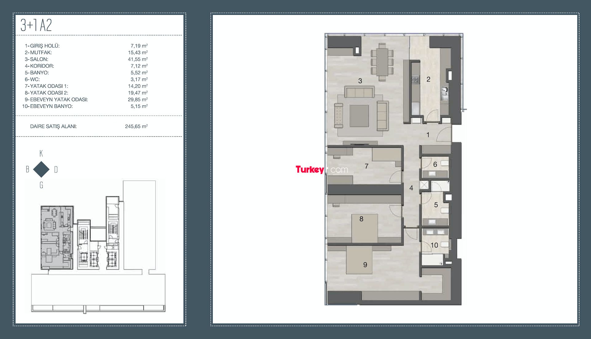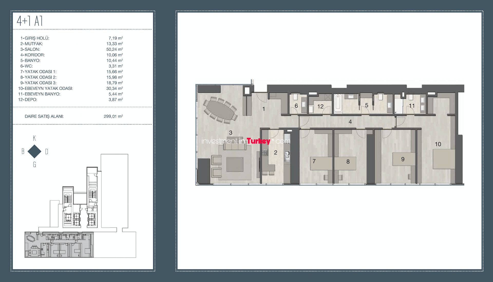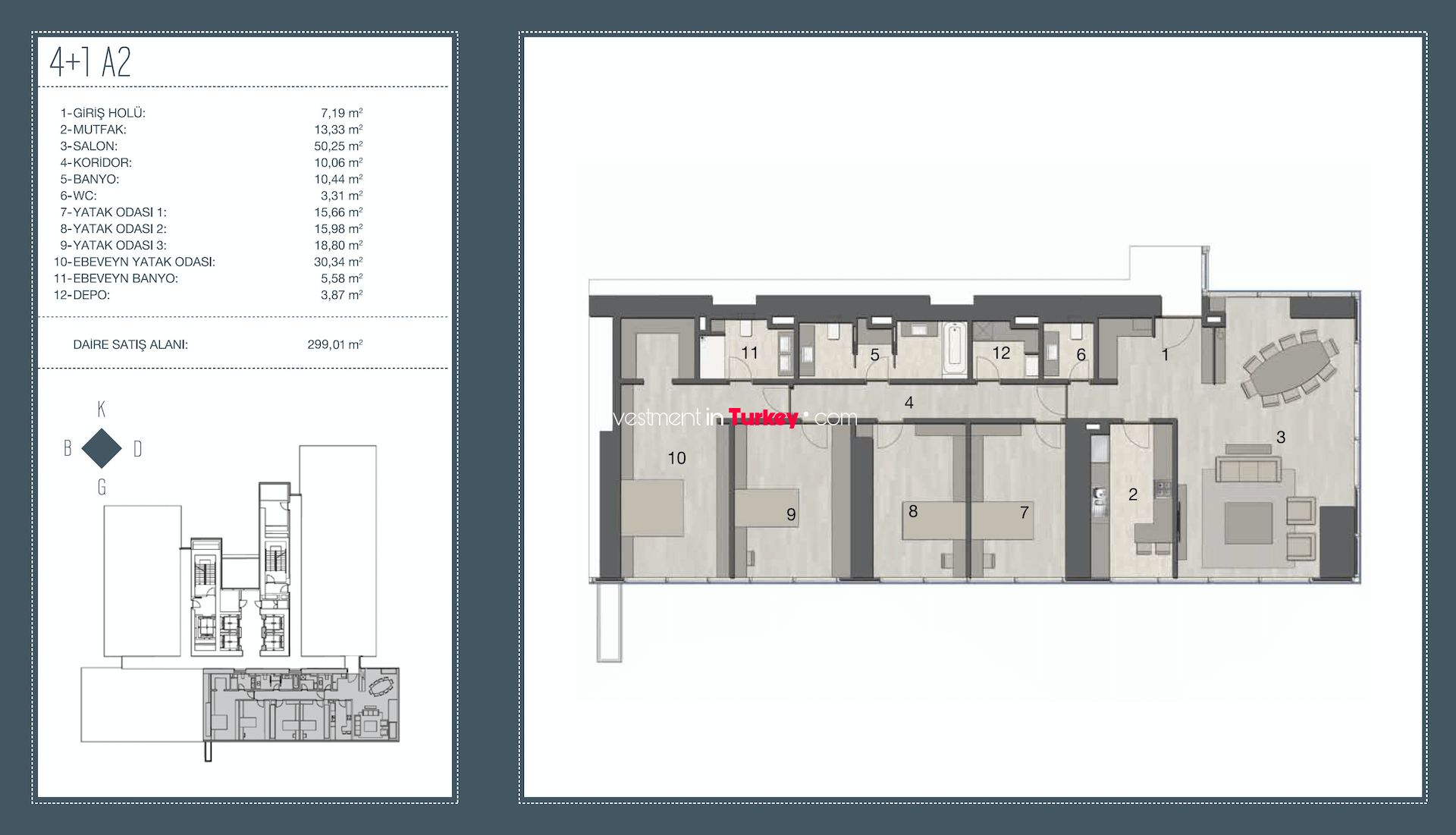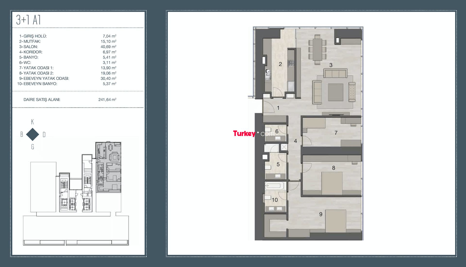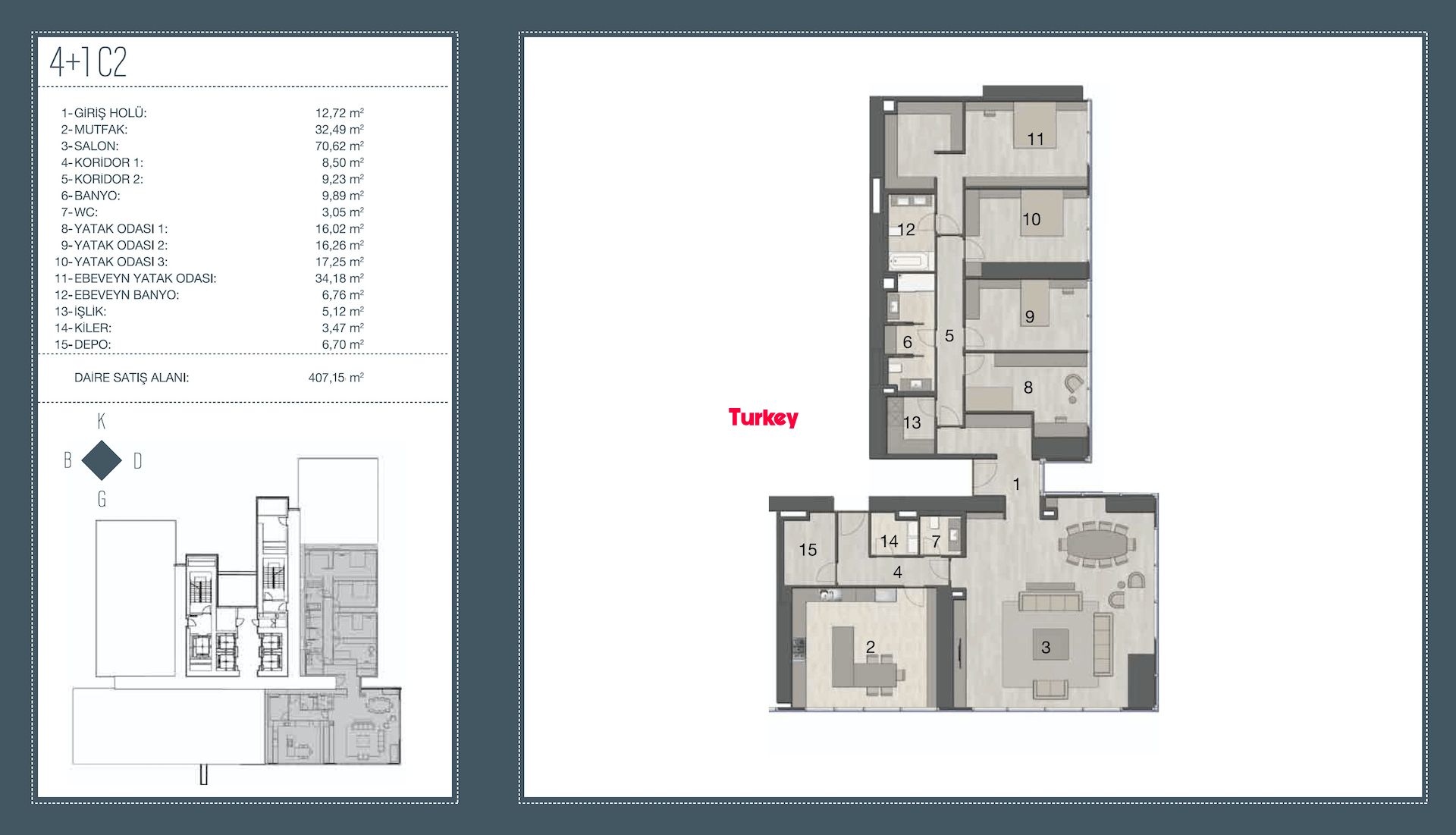 The sizes of all residences in the project, from 1+1 to 4+1, which are equipped with features that can meet all the demands of modern life, vary between 100 and 425 m².